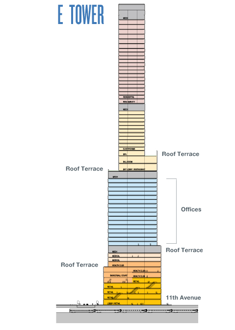 E Tower will be the third skyscraper built as a phase 1 development. Designed by David Childs of SOM, this mixed-use building will have 61 story of which 21 will be luxury residences, 17 floors of office space, 4 retail floors and luxury hotel on 11 floors which will include a Ballroom, Sky Lobby and Spa. E Tower will be 290m (950ft) tall.